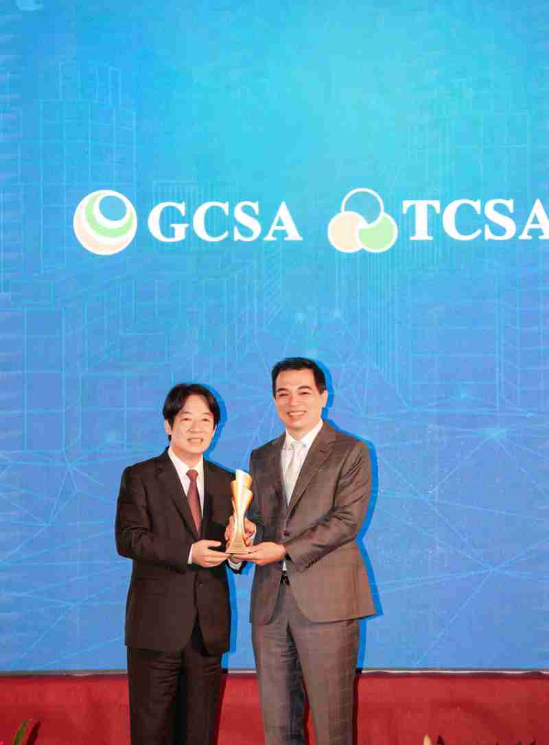 达全方位永续表现获全球永续奖及台湾永续奖肯定,,,由副总统赖清德颁奖 (左),,银河集团总经理柯富仁 (右) 代表领奖