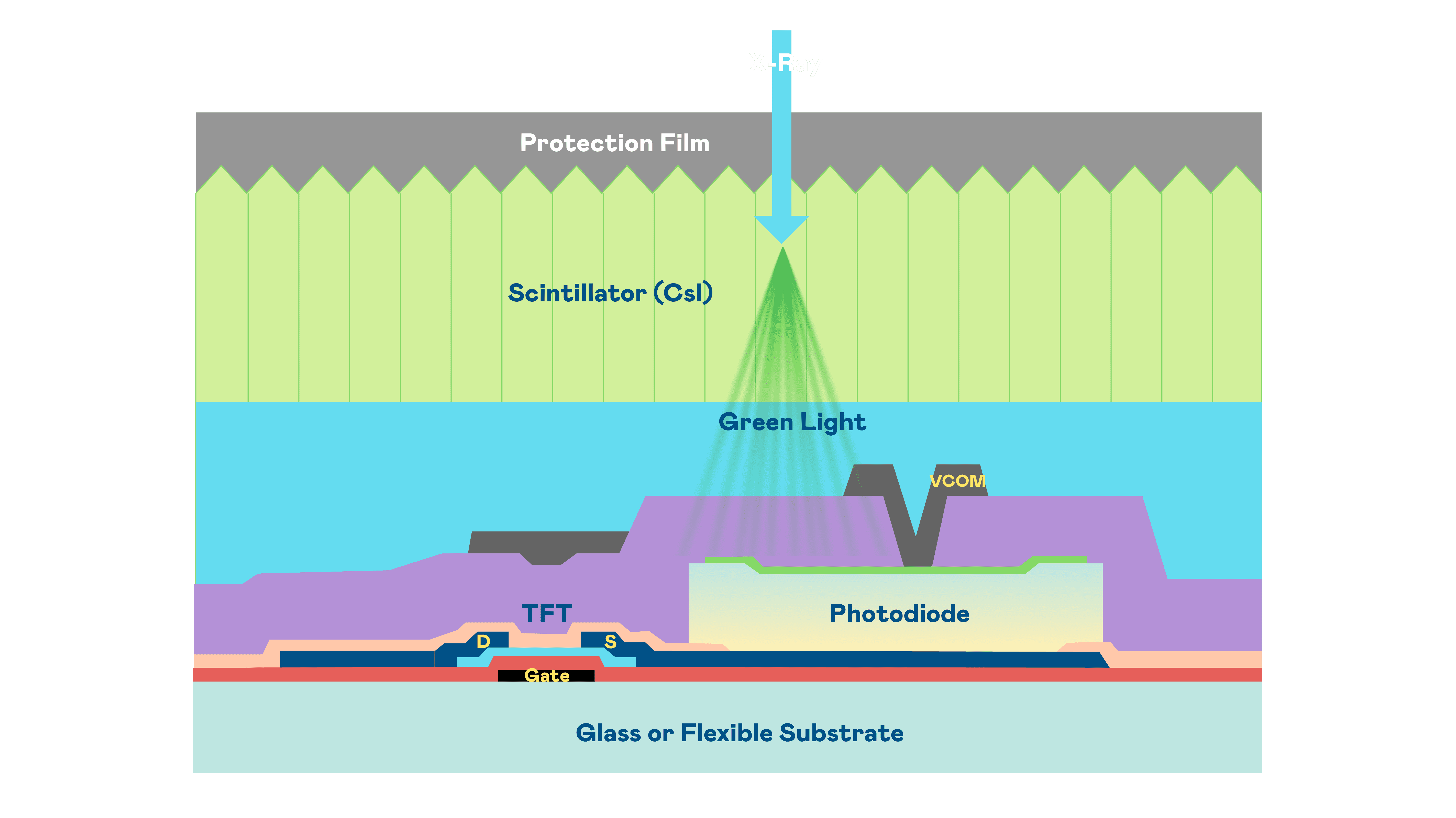 银河集团的X光影像感测阵列使用薄膜电晶体 (TFT) 作为每个像素的读取开关,,,,搭配光电二极体(Photodiode)的光电转换元件,,,用以感测X光影像讯号。。。
